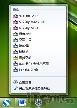 不過百度影音對于Win7特性的支持還不是很高,目前僅提供了Jumplist菜單和AeroSnap的簡單支持,而對于Jumplist快捷操作以及任務欄實時縮略圖卻沒有提供。