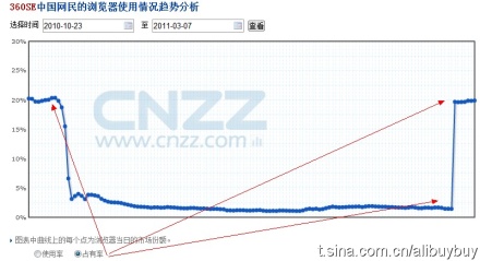 自從3Q大戰以來,360瀏覽器就一直使用IE的識別標志,使得外界無法獲知360瀏覽器的實際份額。CNZZ自3月開始對360瀏覽器進行了重新統計,360瀏覽器占有量3月1號后出現異常波動,直線上升(見下圖)。2010年10月31號占有量為20.8%,11月2號后開始直線下跌,到11月5日跌倒3%,而后占有量一路都在在2%以下。突然從3月1號直線上升,幾乎一夜恢復到了去年3Q大戰前的水平。目前360瀏覽器的占有率已經恢復戰前水平,但已經低于IE8,名列第三。