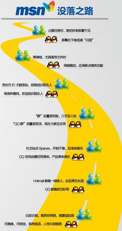 但MSN不作為,連新浪都在推他的UC,MSN就沒有落井下石。我覺得這個時候必須落井下石。3Q大戰(zhàn)以前我們跟阿里巴巴的人也在聊,巨頭之間相互打,根本沒有任何打敗對方的可能性,只有等其中一個人犯昏招。QQ出的那招其實挺昏的,只要有比較勇猛的東西攻上來,至少白領(lǐng)這塊兒人群就能挖回來,因為QQ那時候有很多人去卸載它了,至少很多人對它有意見。微博上大家都在罵,連我哥、我姐、他們家讀小學的小朋友都問我這個事情。MSN應(yīng)該猛攻上去,直接把那批有情緒的人承接過來,那個時候大量的人在電腦上還裝載著MSN呢。