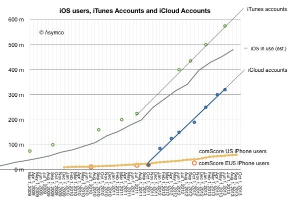 圖表中給出了擁有已激活iTunes賬號的用戶總數,以及擁有iCLoud賬號的用戶總數;此外,地區性的iPhone數據則對iOS設備的用戶增長提供了某種額外的測試。最終得出的結果是,iOS活躍用戶總數“大約為5億人”,每個月增加1100萬人左右。