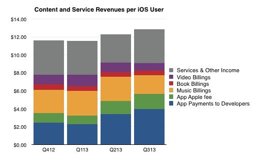 在得出iOS生態系統中共有大約5億名活躍用戶的推斷以后,下一步要做的事情就是對這些用戶所能創造的價值進行測量。根據蘋果公布的數據,iTunes服務的季度總營收為42.6億美元;再考慮到媒體零售和購買活動相關數據,iOS用戶平均季度支出的圖表就呼之欲出了。詳見下圖: