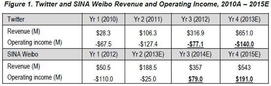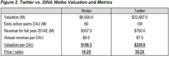 T. H. Capital報告指出,阿里巴巴第一步投資占股18%,新浪微博估值是32.6億美元,阿里巴巴會進行第二步投資,再獲得新浪微博12%的股份,此時新浪微博的估值翻倍,達到65.1億美元。參照Twitter上市各項數據,新浪微博這一估值并不算高。