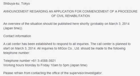 據(jù)國外媒體報(bào)道,剛剛宣布破產(chǎn)的Mt.Gox日前在其官網(wǎng)上發(fā)布了一則日語和英語的公告,并提供了一個(gè)電話號(hào)碼,接受來自所有用戶任何有關(guān)于Mt.Gox問題的詢問。