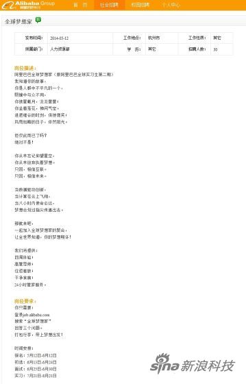 根據阿里巴巴集團招聘頁面的信息,“全球夢想家”的工作時長為期四周,一共有30個名額,應聘者無論使用什么形式:文字、PPT、視頻……只要按照要求回答頁面上的三個問題,即可提交申請,阿里會按照“有夢想、正能量”的標準進行篩選。