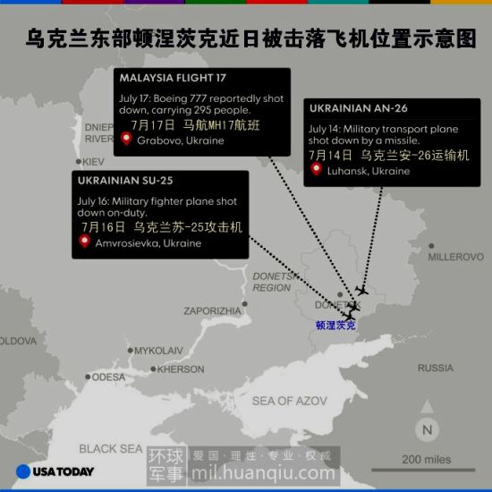 烏克蘭東部頓涅茨克近期被擊落飛機(jī)位置示意圖