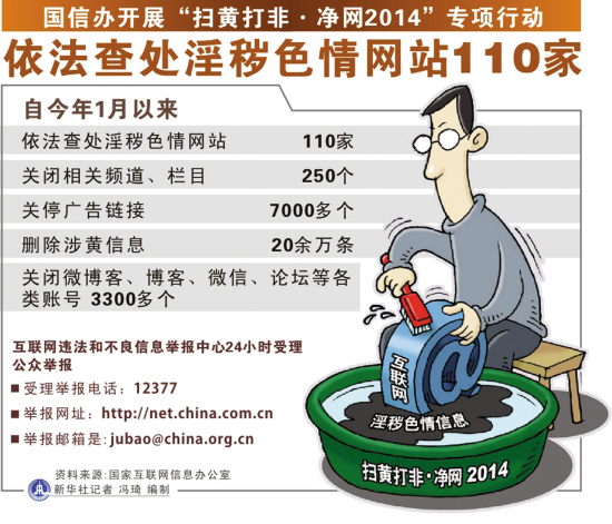 針對互聯網傳播淫穢色情信息問題,北京市文化市場行政執法部門從2013年起,連續開展“凈網”行動,今年以來已重點對網絡文學網站、手機文學網站、移動智能終端應用程序平臺等進行檢查,查禁淫穢色情網絡小說、視聽節目等文化產品745種,立案40起,罰沒款544.95萬元;吊銷許可證2個,關閉網站48家,責令網站清理淫穢色情信息30余萬條,關閉貼吧、論壇612個,封停用戶703個。