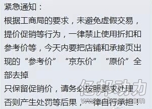 商家截圖顯示,京東已經(jīng)發(fā)布緊急通知,稱工商局要求,一律禁止電商平臺(tái)使用折扣和參考價(jià)等信息,因此,商家必須在今天內(nèi)把店鋪和承接頁面出現(xiàn)的所有“參考價(jià)”“京東價(jià)”“原價(jià)”等字眼全部去掉;商家只能保留促銷價(jià)。