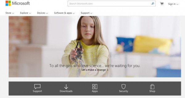 目前,微軟官網(wǎng)首頁的重點(diǎn)是婦女影響技術(shù),這是一個(gè)敏感的話題,因?yàn)榭萍紭I(yè)傳統(tǒng)上由男性主導(dǎo)。就目前的布局而言,英雄形象的重點(diǎn)是對科學(xué)感興趣的少女,而頁腳圖像是11位女性科技業(yè)領(lǐng)導(dǎo)者,她們正在改變創(chuàng)新生態(tài)系統(tǒng)。