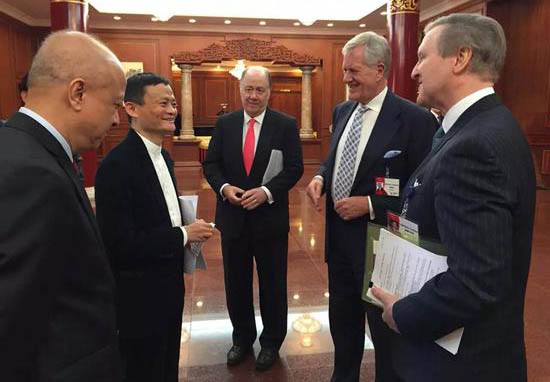 (圖為馬云與中國發展研究基金會秘書長盧邁等,來自新浪網)