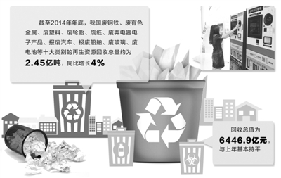 日前,商務部會同有關單位完成了《中國再生資源回收行業發展報告(2015)》,該報告顯示,截至2014年底,我國廢鋼鐵、廢有色金屬、廢塑料、廢輪胎、廢紙、廢棄電器電子產品、報廢汽車、報廢船舶、廢玻璃、廢電池等10大類別的再生資源回收總量約為2.45億噸,同比增長4%;回收總值為6446.9億元,與上年基本持平。