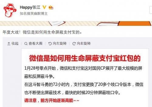 微博網友曝年度大戲:微信與支付寶屏蔽與反屏蔽斗爭