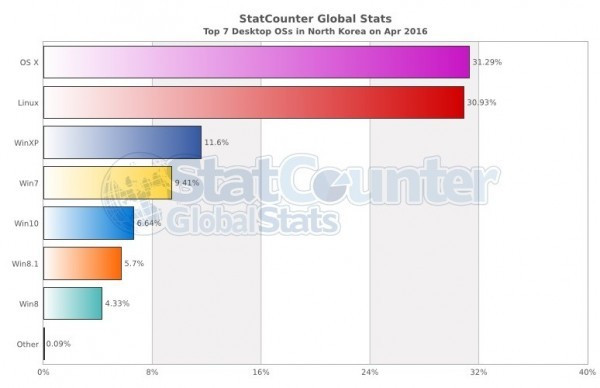 我們已經知道,金正恩是一個蘋果迷,但是看到那么多朝鮮人使用Mac OS X仍然讓人驚喜。根據StatCounter統計數據顯示,蘋果Mac OS X操作系統在朝鮮市占率達到31.29%,位居第一。位居第二的是開源的Linux操作系統,Linux操作系統在該國的市占率達到30.92%。