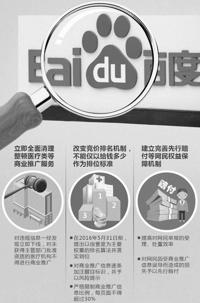 調查組在整改要求中明確表示,從即日起對醫療、藥品、保健品等相關商業推廣活動,進行全面清理整頓,對違規信息一經發現立即下線,對未獲得主管部門批準資質的醫療機構不得進行商業推廣。與此同時,還要求改變競價排名機制,提出以信譽度為主要權重的排名算法并落實到位;對商業推廣信息逐條加注醒目標識,并予以風險提示;嚴格限制商業推廣信息比例,每頁面不得超過30%。