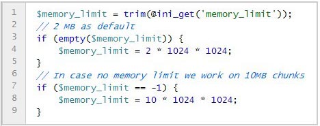 說明:首選讀取php.ini配置文件中的內(nèi)存配置選項(xiàng)memory_limit,如果為空則默認(rèn)內(nèi)存大小限制為2M,如果沒有限制則內(nèi)存大小限制為10M,你可以結(jié)合你php.ini配置文件中的相關(guān)信息修改這段代碼。