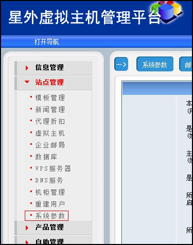 登陸后,點(diǎn)擊“站點(diǎn)管理”——“系統(tǒng)參數(shù)”,如圖: