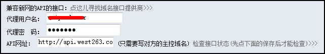 這里要求輸入代理用戶名、代理密碼以及API網(wǎng)址。代理用戶名和密碼參見說(shuō)明文檔開頭設(shè)置的密碼。API網(wǎng)址填寫:http://api.west263.com。如圖: