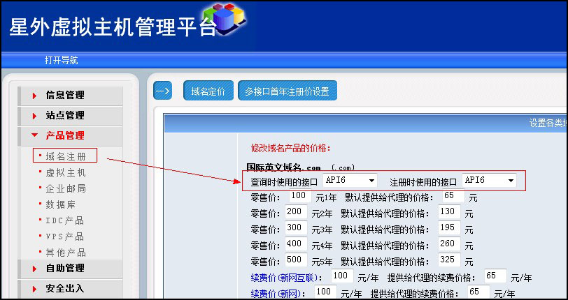 然后點(diǎn)擊“產(chǎn)品管理”——“域名注冊(cè)”,將右側(cè)的所有域名查詢接口和注冊(cè)接口都選擇“API6”,如圖: