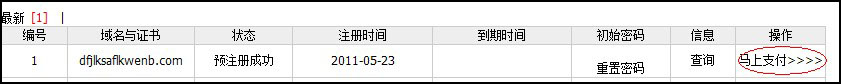 系統(tǒng)會(huì)提示“預(yù)注冊(cè)成功,馬上付費(fèi)>>>”,點(diǎn)擊后系統(tǒng)會(huì)轉(zhuǎn)到域名管理列表,您剛注冊(cè)的域名會(huì)提示“預(yù)注冊(cè)成功”,點(diǎn)擊最右側(cè)的“馬上支付>>>>” 就正式注冊(cè)成功了,如圖: