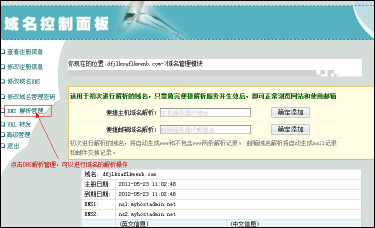 域名管理面板界面,點(diǎn)擊"DNS解析管理"可以進(jìn)行域名解析。如圖: